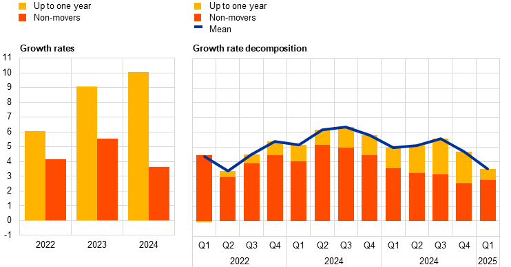 Notes: Calculations are based on weighted estimates. Panel a) comprises a subsample of renters with a known duration of residence. The blue line depicts the combined two-quarter moving average of the year-on-year growth rate of the rents divided by square metres. “Up to one year” refers to the contribution of respondents who have lived in their current residence for one year or less. Panel b) comprises a full sample of renters. The latest two-quarter moving average of the year-on-year growth rate refers to January 2025. “Average rent growth” is the average of the year-on-year growth rates in the sample period (January 2024 to January 2025).