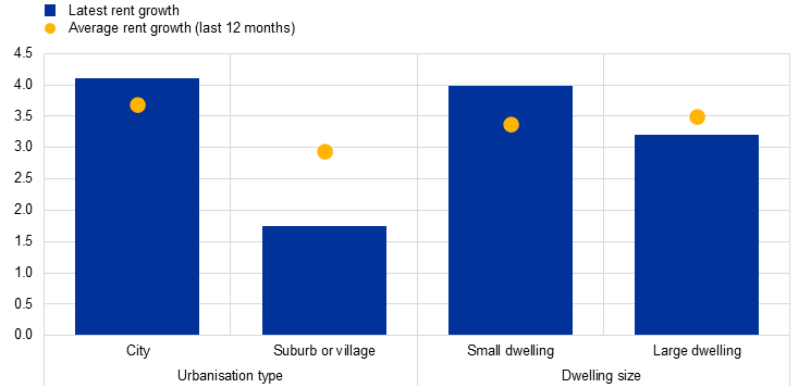 Recent rent growth reported in the CES has been higher in cities and for smaller dwellings. Chart C, panel b) shows that rent growth in cities has remained higher than rent growth in suburbs and rural areas and that the difference seems to have widened in the recent past. CES data also point to somewhat higher rent growth for smaller dwellings compared with larger ones, whereas growth rates were broadly equal in the past.