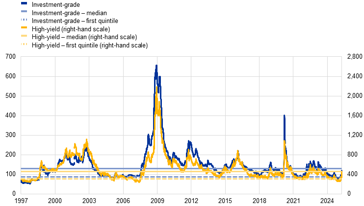Prior to the recent abrupt widening, US corporate bond spreads experienced a prolonged phase of unusual resilience, despite a backdrop of elevated interest rates. Throughout 2024, the risk premium required by investors to hold US corporate debt over government securities – as measured by non-financial corporate bond spreads – remained remarkably compressed. Investment-grade corporate bond spreads ranged between 83 and 112 basis points, while high-yield spreads fluctuated between 264 and 393 basis points. Spreads stood at their lowest levels in nearly two decades, falling within the first quintile of the historical spread distribution since 1999 (see Chart A). However, more recently, US corporate spreads have widened significantly, increasing to 120 basis points for investment-grade and 461 basis points for high-yield bonds. This abrupt shift has coincided with the announcement of new tariffs by the US administration, which has triggered a sharp deterioration in market risk sentiment. Against this backdrop, and in light of the recent market repricing, this box examines the factors that contributed to the previous resilience of US corporate bond spreads and assesses the potential risks of spread decompression in the period ahead.