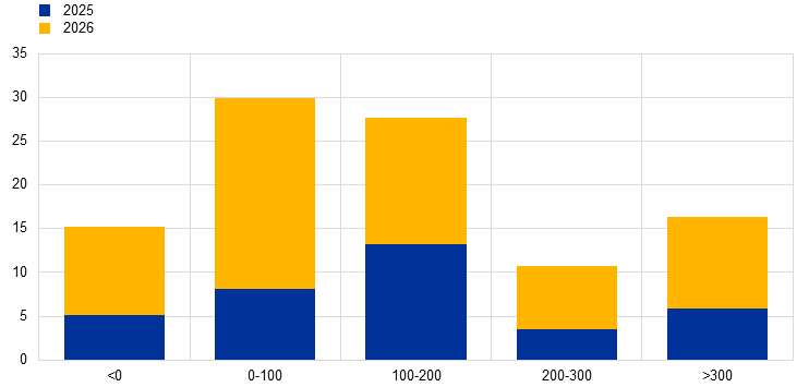 Notes: Interest rate increases to refinance maturing bonds are calculated by comparing current yields on corporate bonds in secondary markets (i.e. the yield to maturity) with rates prevailing at the time of bond issuance (i.e. the coupon). The x-axis shows estimated interest rate increases in basis points. The y-axis shows percentages of total outstanding debt maturing in 2025 or 2026. The latest observation is for 11 April 2025 (weekly data).