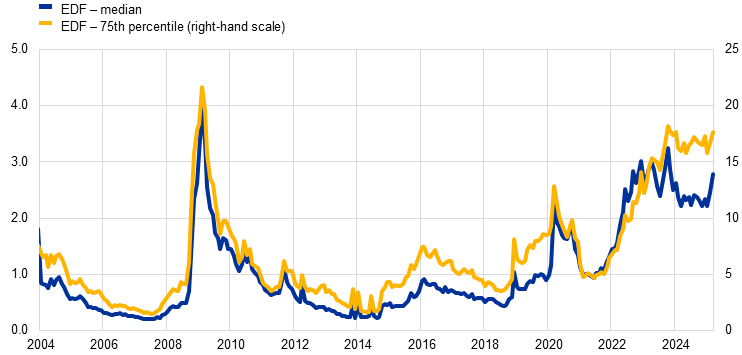 Notes: The chart shows the median and 75th percentile (third quartile) EDF within one year for non-financial corporations in the United States. The EDF is a market-based measure developed by Moody’s KMV that indicates the probability that a company will default (fail to make scheduled debt payments) within one year. The latest observations are for 31 March 2025 (monthly data).