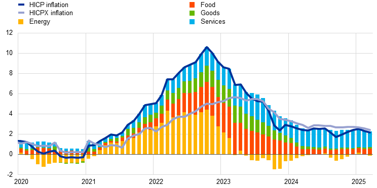 Euro area headline inflation, as measured in terms of the Harmonised Index of Consumer Prices (HICP), decreased to 2.2% in March from 2.3% in February (Chart 8). This fall was mainly driven by a decline in services and energy inflation, which more than offset the rise in food inflation. The inflation outcome for the first quarter of 2025 was broadly in line with the March 2025 ECB staff macroeconomic projections for the euro area.