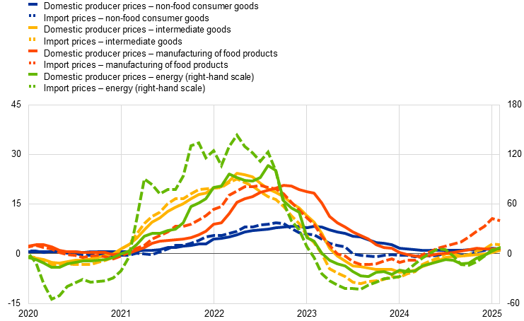 Over the review period from 6 March to 16 April 2025, Brent crude oil prices declined by 3.7% to USD 69 per barrel and by 8.4% in EUR per barrel, while European gas prices decreased by 5.7% in EUR/MWh. Oil prices fell sharply following the announcement of US “reciprocal” tariffs, as concerns about the impact of tariffs on global oil demand as well as their negative effect on risk sentiment across financial markets outweighed earlier supply-related worries. Downward pressures on oil prices were amplified by the decision by OPEC+, which was released on the same day as the announcement of “reciprocal” US tariffs, to speed up the phasing-out of earlier production cuts. OPEC+ members announced they would increase output by 411,000 barrels per day in May, up from a previous target increase of 135,000 barrels. European gas prices fell sharply, driven by demand concerns following the announcement of US tariffs. Furthermore, recent news on the progress made on an EU agreement on targets for filling natural gas storage, which would give EU countries more flexibility in meeting the 90% target for next winter, contributed to a reduction in gas prices. Metal prices declined by 6.8% on growth concerns following the US tariff announcements, even though these did not directly target metal imports. Prior to the announcements, expectations of specific tariffs on copper had prompted traders to frontload copper imports, widening the gap between prices in London and New York and filling warehouses to record levels. In contrast, food prices declined by only 1.5% following the tariff announcements, as concerns with regard to US corn supply supported prices to some extent.