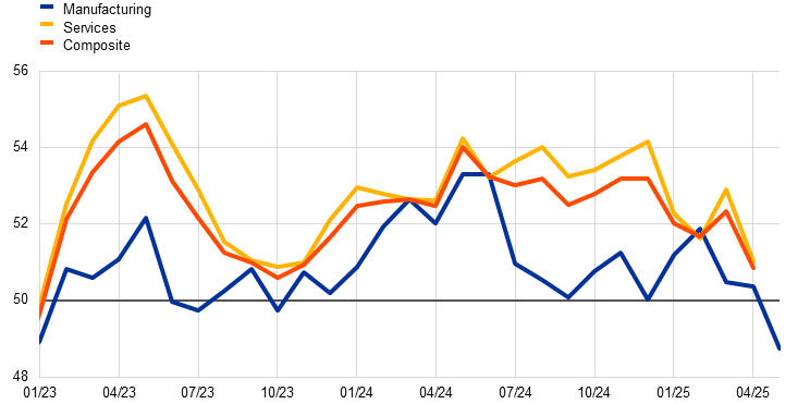 Note: The latest observations are for May 2025 for the manufacturing output index and April 2025 for the services and composite output indices.
