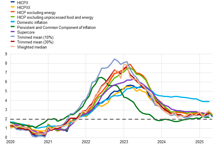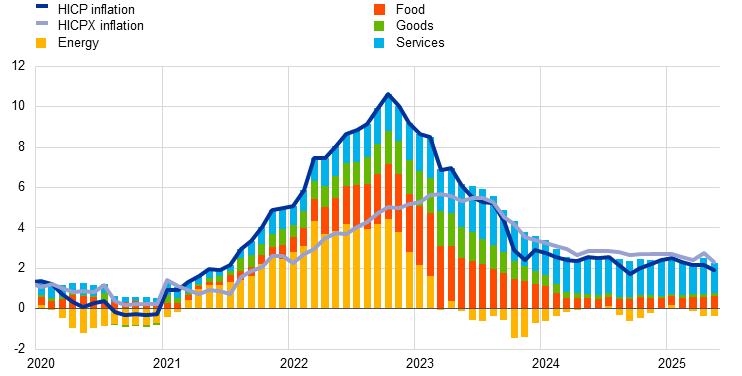 Euro area headline inflation is currently at around the Governing Council’s 2% medium-term target. According to Eurostat’s flash estimate, it decreased to 1.9% in May 2025 from 2.2% in April. This decline solely reflects a drop in HICP inflation excluding energy and food (HICPX), which was driven by a marked fall in services inflation. Food inflation increased, while energy inflation and non-energy industrial goods inflation were unchanged. Most measures of underlying inflation suggest that inflation will stabilise sustainably at the ECB’s 2% medium-term target. Wage growth is still elevated but continues to moderate visibly, and profits are partially buffering its impact on inflation. Most measures of longer-term inflation expectations continue to stand at around 2%. Inflation has continued to develop broadly as projected by Eurosystem staff.