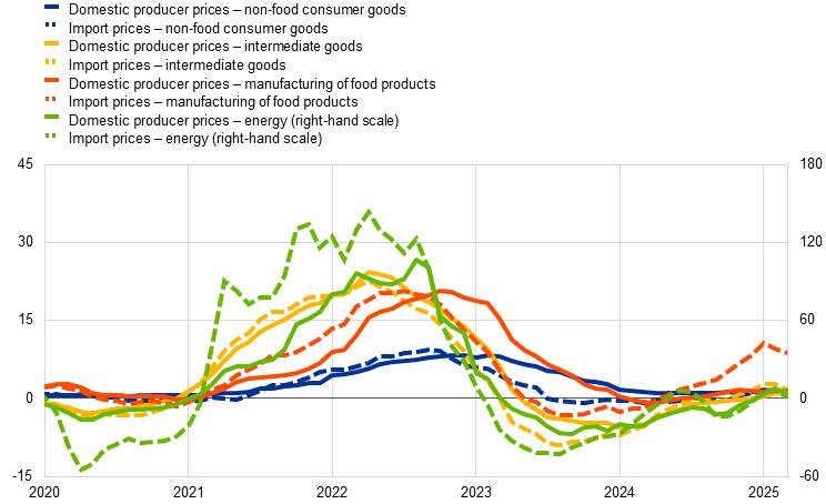 European gas prices increased over the review period, owing to a combination of supply and demand factors. Initially, gas prices fell, amid trade tensions and discussions within European institutions about easing regulatory storage targets for the upcoming heating season. These developments pushed short-term gas futures below longer-term prices, causing the spread between summer and winter futures to turn negative again, which, in turn, incentivised storage restocking. Gas prices subsequently rebounded on the back of latest trade agreements, unplanned outages at Norwegian liquefied natural gas processing plants and the European Commission’s plan to phase out Russian gas imports by 2027. Metal and food prices also increased, driven primarily by demand factors. Food prices were supported by resilient demand for cocoa semi-finished products, despite the sharp surge in cocoa prices earlier this year. Metal prices increased, driven by rising copper prices. The initial support came from sustained precautionary imports in the United States, driven by concerns over higher tariffs on imported copper. This was later reinforced by improved market sentiment following the easing of trade tensions between China and the United States.