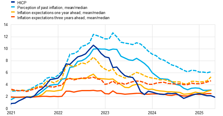 Short-term consumer inflation expectations edged up in April 2025, likely reflecting news about trade tensions. But most measures of longer-term inflation expectations continue to stand at around 2%, which supports the stabilisation of inflation around the Governing Council’s target.