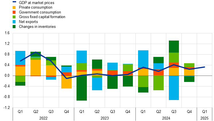Note: The latest observations are for the first quarter of 2025 for GDP and for the fourth quarter of 2024 for the expenditure breakdown.