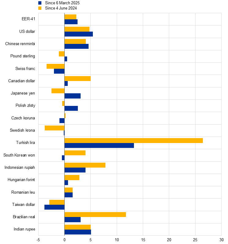 Notes: EER-41 is the nominal effective exchange rate of the euro against the currencies of 41 of the euro area’s most important trading partners. A positive (negative) change corresponds to an appreciation (depreciation) of the euro. All changes have been calculated using the foreign exchange rates prevailing on 4 June 2025.