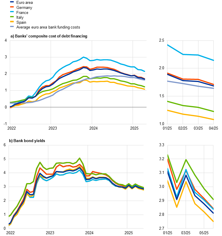 Notes: Composite bank funding costs are an average of new business costs for overnight deposits, deposits redeemable at notice, time deposits, bonds and interbank borrowing, weighted by their respective outstanding amounts. Average bank funding costs use the same weightings but are based on rates for outstanding deposits and interbank funding, and on yield to maturity at issuance for bonds. Bank bond yields are monthly averages for senior tranche bonds. The latest observations are for April 2025 for the composite cost of debt financing for banks (panel a) and for 4 June 2025 for bank bond yields (panel b).