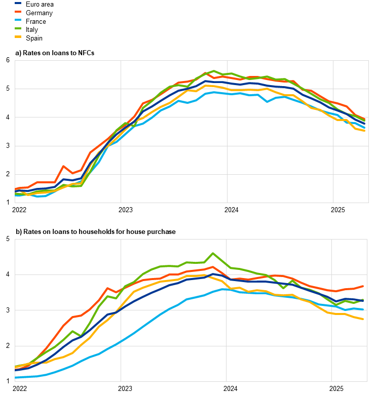 Bank lending rates for firms continued to decline while mortgage rates for households remained broadly stable, reflecting differences in loan fixation periods. In April 2025, lending rates for new loans to non-financial corporations (NFCs) fell by 14 basis points to stand at 3.79%, a decline of around 1.5 percentage points from their October 2023 peak (Chart 20, panel a). This decline was broad-based across the largest euro area countries and was driven by short-term loans with a maturity of up to one year. By contrast, lending rates on loans with longer maturities remained broadly unchanged, reflecting higher longer-term risk-free rates. The spread between interest rates on small and large loans to firms remained stable in April at 46 basis points, slightly above its historical low and with some variation across countries. For households, lending rates on new loans for house purchase fell by 5 basis points to stand at 3.27% in April, around 80 basis points below their November 2023 peak, albeit with some variation across countries (Chart 20, panel b). That said, mortgage rates on purely new loans, i.e. excluding renegotiations, remained broadly stable. The disparity between lending rates for households and those for firms reflects differences in loan fixation periods. Household loans typically have longer fixation periods, making them less sensitive to short-term market rate fluctuations.
