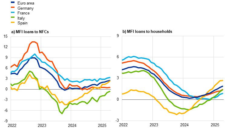 Notes: Loans from monetary financial institutions (MFIs) are adjusted for loan sales and securitisation; in the case of non-financial corporations (NFCs), loans are also adjusted for notional cash pooling. The latest observations are for April 2025.