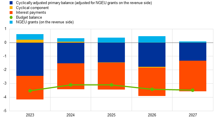 According to the June 2025 Eurosystem staff macroeconomic projections, the euro area general government budget balance is expected to decline over the projection horizon (Chart 24).[14] Looking back, the euro area budget deficit declined from 3.5% in 2023 to 3.1% of GDP in 2024. This was due to the unwinding of most of the remaining energy and inflation-related fiscal support measures. Looking ahead, it is expected to remain unchanged in 2025 and then increase to 3.4% of GDP in 2026 and further to 3.5% of GDP in 2027. This path mainly reflects the projected evolution of the fiscal stance – as measured by the cyclically adjusted primary balance adjusted for NGEU grants – and, in 2027, the discontinuation of grants offered under the NGEU programme, which ends in 2026.[15] The cyclical component of the budget balance, which reflects output gap developments, is projected to be broadly neutral over the projection horizon.