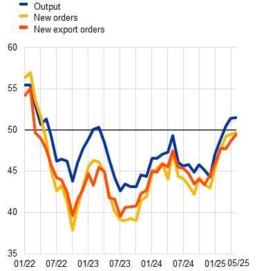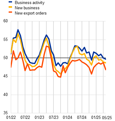 Survey data point to a slowdown in growth in the second quarter of 2025, amid elevated uncertainty. Uncertainty surrounding economic policy – including trade policy – at the global level continues to weigh on the near-term outlook. The composite output PMI fell back slightly to 50.3 on average in April and May (from 50.4 in the first quarter), indicating stagnating output. While the manufacturing output PMI has improved to levels not seen since the beginning of 2022, pointing now to growth, business activity in the services sector has declined, standing at levels indicative of falling activity (Chart 4). The PMI for new orders – which is more forward looking by nature – portrays a similar picture, with an overall lacklustre performance masking improving manufacturing and slowing services activity. Following some positive short-term effects, such as increased production from the frontloading of exports, higher tariffs might have a disproportionately adverse effect on the manufacturing sector compared with other parts of the economy in the months ahead.