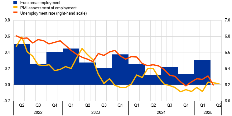 Notes: The two lines indicate monthly developments, while the bars show quarterly data. The PMI is expressed in terms of the deviation from 50, then divided by 10 to gauge the quarter-on-quarter employment growth. The latest observations are for the first quarter of 2025 for euro area employment, May 2025 for the PMI assessment of employment and April 2025 for the unemployment rate.