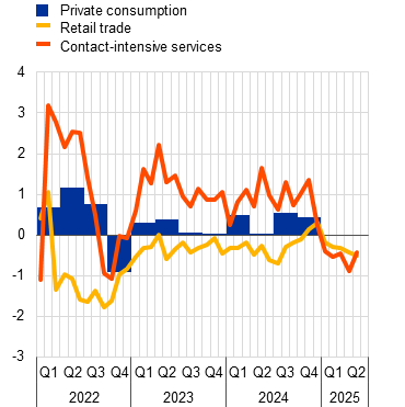 Notes: Business expectations for retail trade (excluding motor vehicles) and expected demand for contact-intensive services refer to the next three months; “contact-intensive services” refer to accommodation, travel and food services. The contact-intensive services series is standardised for the period from 2005 to 2019 and consumer uncertainty is standardised for the period from April 2019 to May 2025 with respect to the average for the fourth quarter of 2021, owing to data availability, while all other series are standardised for the period from 1999 to 2019. The latest observations are for the fourth quarter of 2024 for private consumption and for May 2025 for all other items.