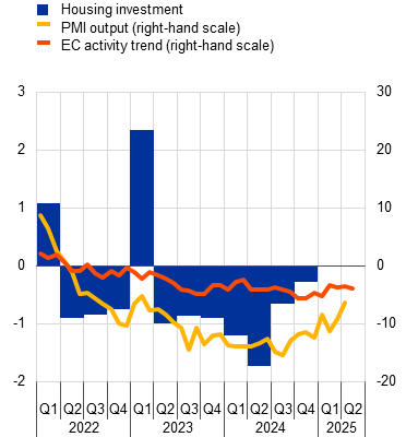 Notes: Lines indicate monthly developments, while bars refer to quarterly data. The PMIs are expressed in terms of the deviation from 50. In panel a), business investment is measured by non-construction investment excluding Irish intangibles. Short-term indicators refer to the capital goods sector. In panel b), the line for the European Commission’s activity trend indicator refers to the weighted average of the building and specialised construction sectors’ assessment of the trend in activity compared with the preceding three months, rescaled to have the same standard deviation as the PMI. The line for PMI output refers to housing activity. The latest observations are for the fourth quarter of 2024 for investment, April 2025 for PMI output and May 2025 for the European Commission’s indicators.