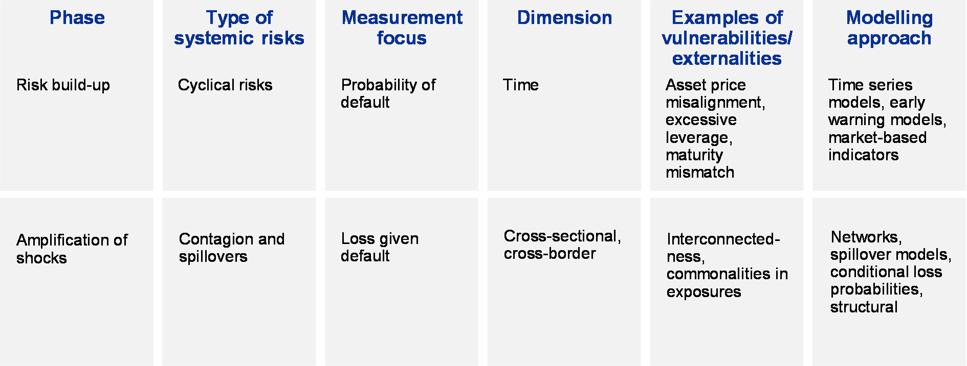 Systemic risk is a multifaceted phenomenon that can be divided into two broad phases.[3] The first phase relates to the build-up of systemic risk, which is characterised by increasing financial imbalances, leverage and exuberance, involving asset price misalignments in the economy. This is often monitored using business and financial cycle measures and their interaction.[4] The second phase relates to the materialisation of systemic risk, i.e. when the transmission of a shock is endogenously amplified by fragilities and frictions within the system. Such amplification and contagion risk is more closely linked to the interconnectedness of financial institutions, whose direct or indirect business relationships may eventually contribute to the level of systemic stress experienced during a crisis. In the monitoring of risks to financial stability, the focus is on assessing the probability that a systemic crisis will materialise, whereas in the monitoring of spillover and contagion risks, the effort is put on assessing the overall damage that a shock could inflict on the financial system.[5] Hence, the risk build-up is usually measured in the time dimension, while shock amplification is seen in terms of the cross-sectional or cross-border dimension (see Figure A.1).