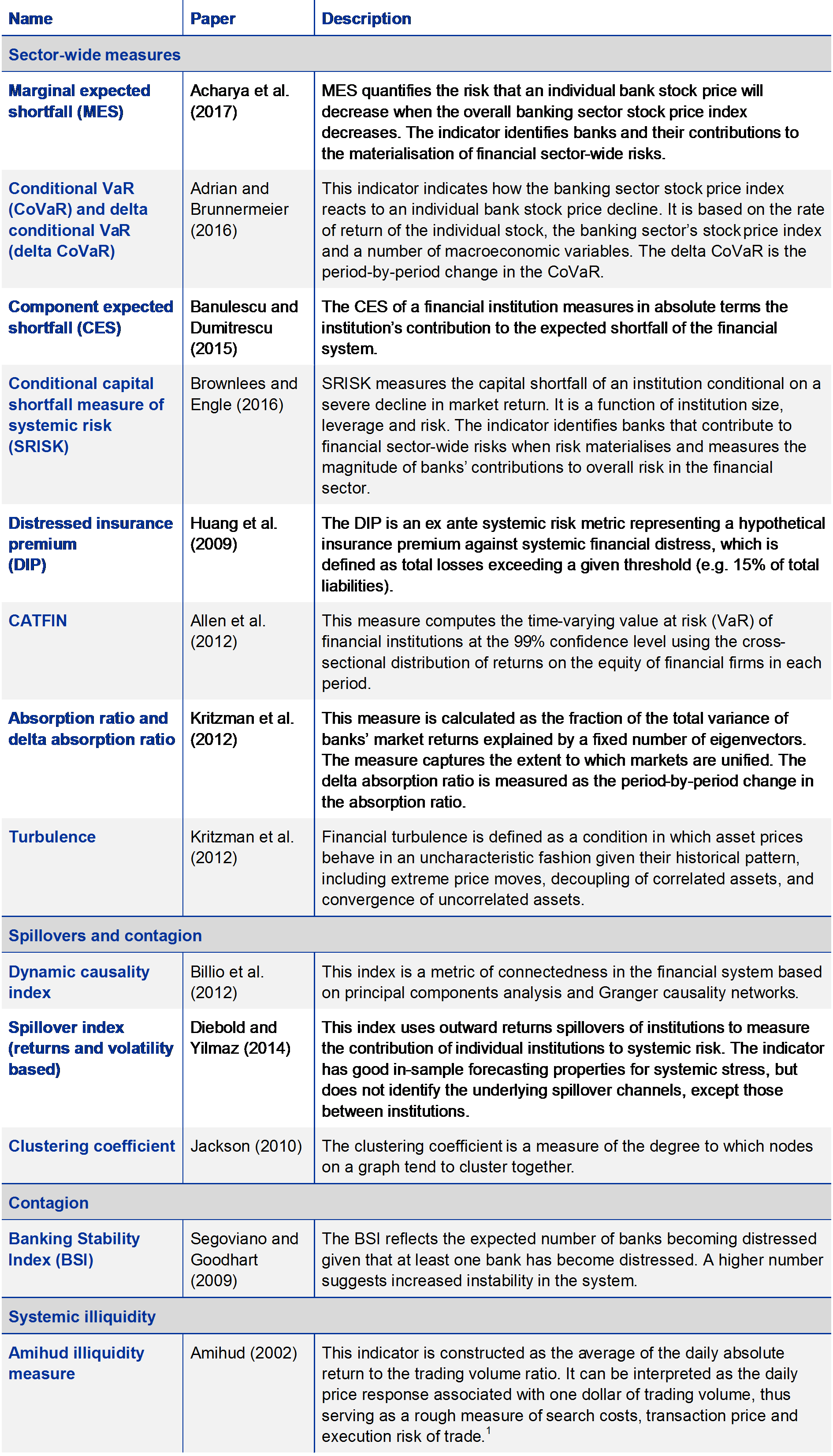 Source: ECB calculations.Notes: Bibliographical references: Acharya, V.V., Pedersen, L.H., Philippon, T. and Richardson, M., “Measuring Systemic Risk”, The Review of Financial Studies, Vol. 30(1), 2017, pp. 2-47.Adrian, T. and Brunnermeier, M.K. “CoVaR”, American Economic Review, Vol. 106(7), 2016, pp. 1705-1741.Allen, L., Bali, T.G. and Tang, Y., “Does Systemic Risk in the Financial Sector Predict Future Economic Downturns?”, The Review of Financial Studies, Vol. 25(10), 2012, pp. 3000-3036.Amihud, Y., “Illiquidity and stock returns: cross-section and time-series effects”, Journal of Financial Markets, Vol. 5(1), 2002, pp. 31-56.Banulescu, G.-D., and Dumitrescu, E.-I., “Which are the SIFIs? A Component Expected Shortfall approach to systemic risk”, Journal of Banking & Finance, Vol. 50, 2015, pp. 575-588.Billio, M., Getmansky, M., Lo, A.W. and Pelizzon, L., “Econometric measures of connectedness and systemic risk in the finance and insurance sectors”, Journal of Financial Economics, Vol. 104(3), 2012, pp. 535-559.Brownlees, C. and Engle, R.F., “SRISK: A Conditional Capital Shortfall Measure of Systemic Risk”, The Review of Financial Studies, Vol. 30(1), 2017, pp. 48-79.Diebold, F.X. and Yılmaz, K., “On the network topology of variance decompositions: Measuring the connectedness of financial firms”, Journal of Econometrics, Vol. 182(1), 2014, pp. 119-134.Huang, X., Zhou, H. and Zhu, H., “Systemic Risk Contributions”, Journal of Financial Services Research, Vol. 42(1-2), 2012, pp. 55-83.Jackson, M.O., Social and Economic Networks, Princeton University Press, 2010.Kinlaw, W., Kritzman, M. and Turkington, D., “Toward Determining Systemic Importance”, The Journal of Portfolio Management, Vol. 38(4), 2012, pp. 100-111.Segoviano, M.A. and Goodhart, C.A.E., “Banking Stability Measures”, IMF Working Paper, No 09/4, International Monetary Fund, 2009.1) Surges in search costs, transaction prices and execution risks of trades are signs of market liquidity vaporising in times of turmoil, as evidenced in the recent financial crisis (see, for example, Gârleanu, N. and Pedersen, L.H., “Liquidity and Risk Management”, American Economic Review, Vol. 97(2), 2007, pp. 193-197; and Brunnermeier, M.K. and Pedersen, L.H., “Market Liquidity and Funding Liquidity”, The Review of Financial Studies, Vol. 22(6), 2009, pp. 2201-2238). These stem from heightened information and agency frictions, such as adverse selection, spreading through an interconnected financial system. Amihud market illiquidity captures such contagion of uncertainty and information frictions in interconnected markets (see Amihud, Y., op. cit.).
