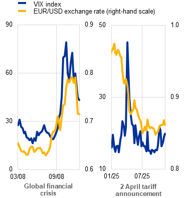 1. Some authors argue that the overall US dollar depreciation observed at this time was due to retaliatory tariffs imposed on the United States by its trade partners. See Corsetti, G., Lloyd, S. and Ostry, D., “Tariffs and US dollar depreciations: Not so surprising after all”, Centre for Economic Policy Research, 3 September 2025.