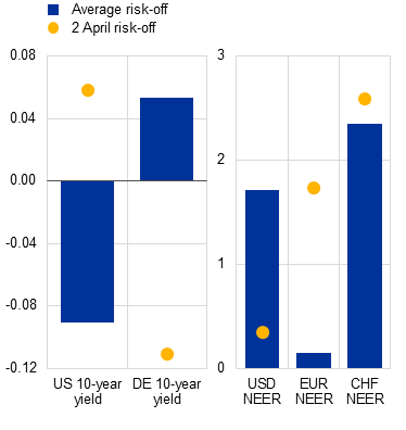 Notes: Panel a: increases in EUR/USD denote US dollar appreciation. Panel b: cumulative percentage changes three days after the event. EUR, USD and CHF NEER refer to nominal effective exchange rates. Average response calculated for five biggest daily VIX changes episodes. “2 April risk-off” is the US tariff announcement on 2 April 2025.