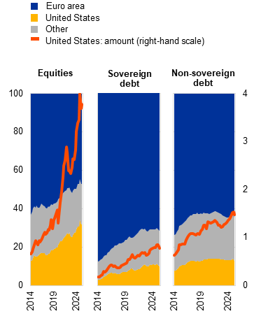 15. It should be noted that investment funds located in the euro area channel investment by global investors, meaning that some of their holdings of US securities do not necessarily represent an exposure to euro area residents. For instance, estimates using security-level data suggest that euro area residents account for only around one-third (or one-quarter in the case of bonds) of investment fund assets held by investment funds in Luxembourg and Ireland. See the box entitled “Geographic biases in international financial statistics” in The international role of the euro, ECB, June 2025.