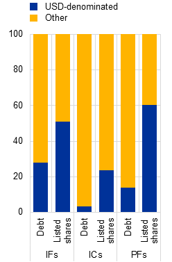 Notes: IFs stands for investment funds; ICs stands for insurance corporations; PFs stands for pension funds. Panel b) and panel c: due to data quality issues, it is currently not possible to reliably estimate the open FX derivative positions held by non-banks. Gross FX derivative notional is correlated with FX hedging activity but includes both long and short FX positions. Cross-currency interest rate swaps are not included under FX derivatives. Holdings of US dollar-denominated assets by bond funds are estimated by subtracting aggregate investment funds’ holdings of euro-denominated US debt, allocated across investment fund subsectors based on their share of US debt holdings, from bond funds’ total US bond portfolios. Total US dollar-denominated bond holdings are calculated by applying the aggregate fund sector’s share of US-issued bonds within the US dollar-denominated debt portfolios. US dollar-denominated equity holdings are proxied by US-issued equity holdings.