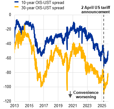 Market commentary has since debated whether the response to the April events was an isolated anomaly or a structural shift in asset price correlations. On the one hand, the change in the cross-asset correlation could have been a temporary phenomenon, driven by a one-off adjustment of global portfolios reflecting the desire of investors to reduce their exposure to US risk, which had been building up in the current business cycle. At the same time, it could also signal a fundamental shift in the perception of the safety of US dollar assets. This has been accompanied by suggestions of eroding confidence in US institutions (on the back of a tariff-focused trade policy, a retreat from international partnerships, concerns about the independence of the Federal Reserve System and big changes in the stance and composition of fiscal policy, among other things).[12]