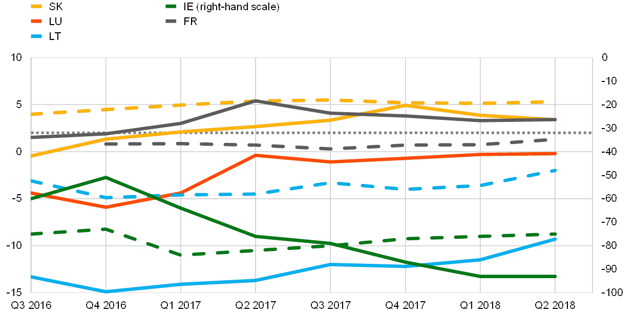 The decisions taken in 2018 to increase CCyB rates provide an opportunity to compare country-specific strategic choices. Among the SSM countries, positive CCyB rates have been set in France, Ireland, Lithuania, Luxembourg and Slovakia (see Table 1). The decisions made by the national designated authorities to increases the rates in 2018 all make reference to the objective of enhancing the resilience of the banking or the financial sector and refer to the concept of cyclical systemic risk. The decisions nevertheless differ in the relative weights given to the objectives of building resilience and mitigating excessive credit growth.[9] Furthermore, in Ireland, Lithuania and Slovakia, the real estate sector played an important role in the assessment of cyclical systemic risk and in motivating the CCyB calibration. Notwithstanding these similarities, the decisions reveal cross-country differences related to the specific timing of activation, the size of the initial activation and considering risks to the financial system as cyclical or structural.