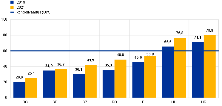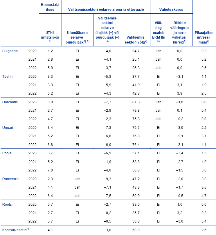 Käesolevas aruandes sisalduvad statistilised andmed on esitatud seisuga 25. mai 2022. Lähenemiskriteeriumide kohaldamisel kasutatavad statistilised andmed esitab Euroopa Komisjon (vt 6. peatükk ning tabelid ja joonised ingliskeelses täispikas versioonis). Vahetuskursside ja pikaajaliste intressimäärade statistilised andmed esitab komisjon koostöös EKPga. Kokkuleppel Euroopa Komisjoniga kestis vaatlusperiood nii hinnastabiilsuse kui ka pikaajaliste intressimäärade kriteeriumi puhul 2021. aasta maist 2022. aasta aprillini. Vahetuskursside vaatlusperiood kestis 26. maist 2020 kuni 25. maini 2022. Eelarvepositsioonide varasemad andmed hõlmavad ajavahemikku kuni 2021. aastani. Arvesse võetakse ka mitmesuguste allikate prognoose ning vaatlusaluse liikmesriigi kõige uuemat lähenemisprogrammi, samuti muud teavet, mis on lähenemise jätkusuutlikkuse ettevaatava hindamise jaoks oluline. Käesolevas aruandes arvesse võetud Euroopa Komisjoni 2022. aasta kevade majandusprognoos ja 2022. aasta häiremehhanismi aruanne[7] avaldati vastavalt 16. mail 2022 ja 24. novembril 2021. EKP üldnõukogu kinnitas aruande 27. mail 2022.