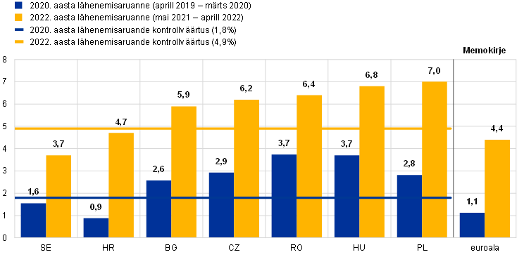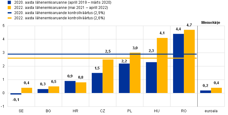 Malta ja Portugali inflatsioonimäär on kontrollväärtuse arvutamisel välja jäetud. Vaatlusperioodil aset leidnud hindade arengu tulemusel oli 12 kuu keskmine inflatsioonimäär neis riikides 2022. aasta aprillis vastavalt 2,1% ja 2,6%. Nende kahe riigi tulemust on kontrollväärtuse arvutamisel käsitletud nn võõrväärtusena, sest mõlema riigi inflatsioonimäär oli vaatlusperioodil märkimisväärselt madalam kui võrreldavad inflatsioonimäärad teistes liikmesriikides ning see tulenes mõlemas riigis erakorralistest teguritest. Inflatsiooni tagasihoidlik areng Maltal kajastas suuresti stabiilseid energiahindu, mis tulenesid valitsuse rahalisest toetusest riigile kuuluvale energiaettevõtjale, kütuseaktsiisi vähendamisest ja indeksi arvutamisega seotud tehnilistest teguritest. Eelkõige muutus 2020. aastal tunduvalt kodumajapidamiste ostukorv, kuigi see oli COVID-19 pandeemiast tingitud ajutine mõju, mis tõi 2021. aastal kaasa indeksi teatud alamkomponentide osakaalude suure muutuse. See muster oli iseäranis märkimisväärne teenusehindade inflatsiooni puhul. Portugali inflatsioonidünaamika erineb euroala omast peamiselt seetõttu, et nii teenuse- kui ka energiahindade kasv oli tagasihoidlikum. Neist esimene viitab turismiga seotud teenuste vähenenud nõudluse suuremale mõjule, kuid teine on tingitud rahvusvaheliste naftahindade ja muude energiakulude väiksemal määral ülekandumisest.[8]
