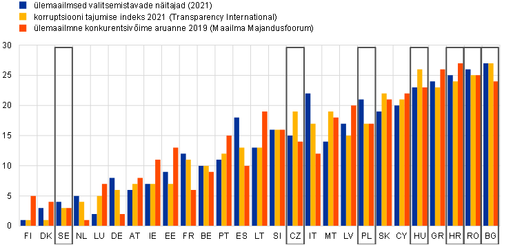 Arvestades tajupõhiste (nt korruptsioon) ja objektiivsemate (nt konkurentsivõime) institutsiooniliste näitajate puudusi ja võrreldavaid eeliseid, on joonistel 3.8 ja 3.9 esitatud mõlemat liiki näitajad.