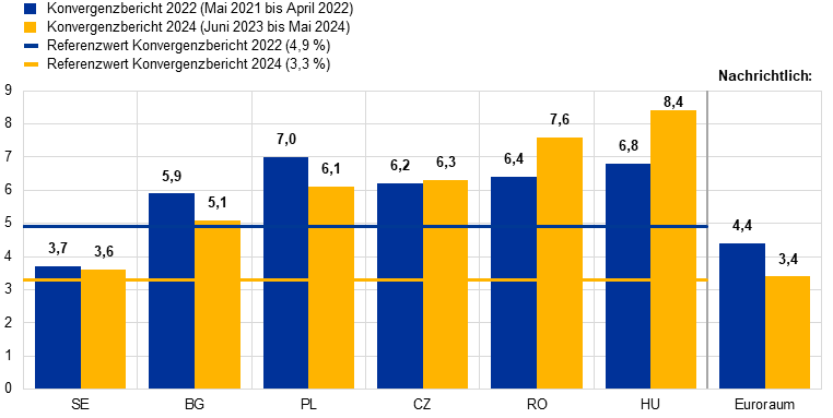 Erstens wurde im Hinblick auf „eine während des letzten Jahres vor der Prüfung gemessene durchschnittliche Inflationsrate“ die Teuerungsrate anhand der Veränderung des Zwölfmonatsdurchschnitts des HVPI im Referenzzeitraum von Juni 2023 bis Mai 2024 gegenüber dem Zwölfmonatsdurchschnitt der Vorperiode berechnet. Die Teuerung wurde auf der Grundlage des HVPI gemessen, der entwickelt wurde, um die Konvergenz im Hinblick auf die Preisstabilität auf vergleichbarer Grundlage beurteilen zu können (siehe Abschnitt 6.2 in der englischen Gesamtfassung des Konvergenzberichts). Zweitens wurde der Vorgabe „höchstens drei [...] Mitgliedstaaten [...], die auf dem Gebiet der Preisstabilität das beste Ergebnis erzielt haben“ Rechnung getragen, indem für den Referenzwert das ungewichtete arithmetische Mittel der Teuerungsraten der drei Mitgliedstaaten mit den niedrigsten Teuerungsraten (ohne Ausreißer) herangezogen wurde.