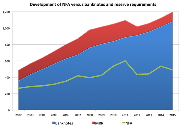 The ECB publishes the Eurosystem’s aggregate net financial assets, and the NCBs will publish their respective net financial assets on an annual basis (at the time of publication of the annual financial accounts). At the end of 2015 the Eurosystem’s aggregate net financial assets stood at €490 billion. NFAs have grown at 5% per year on average since the introduction of euro banknotes in 2002. This is slower than the pace of banknotes in circulation, which grew by 9% per year on average over the same period.