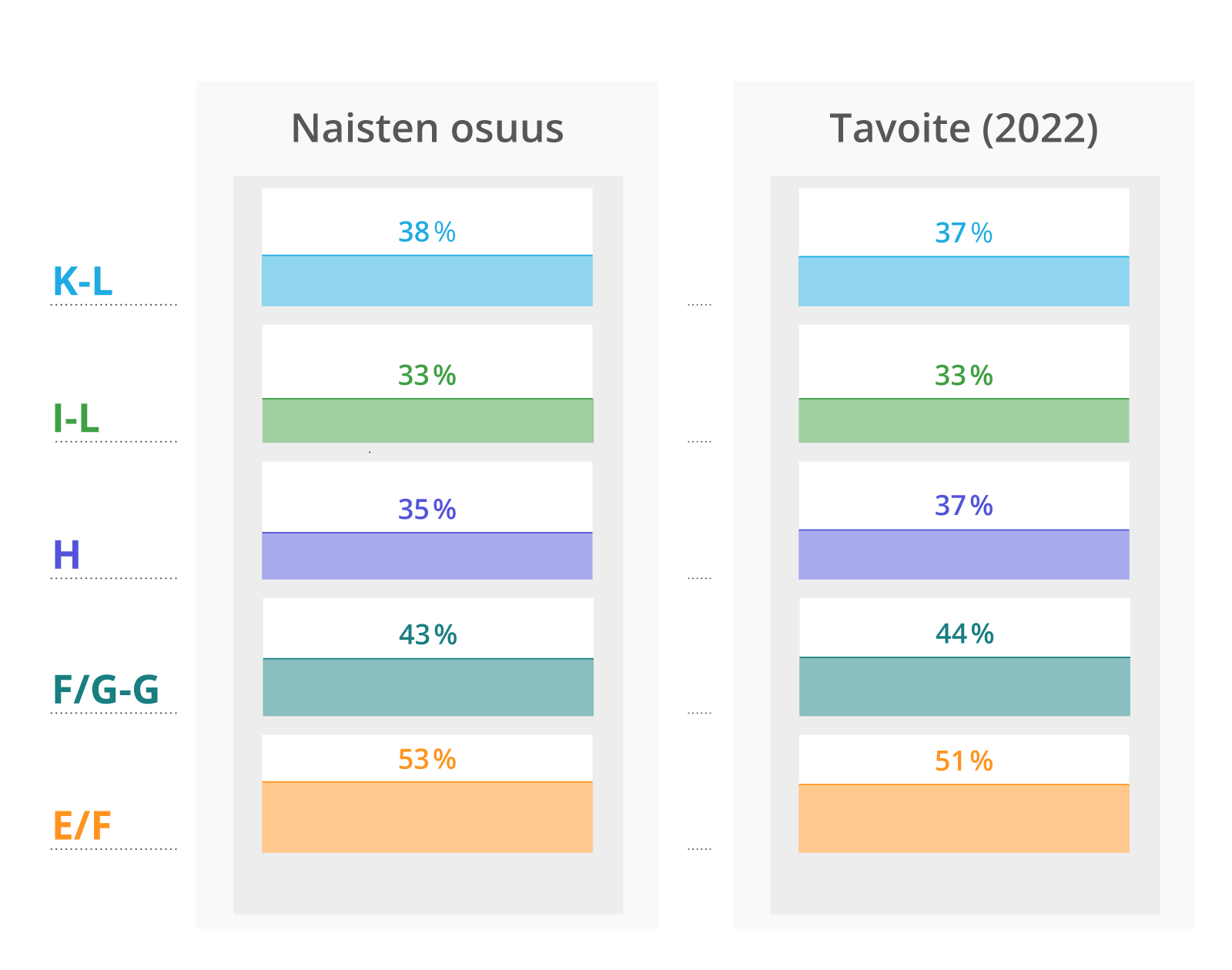 - Ylemmässä johdossa, väliportaan hallinnossa ja analyytikkotehtävissä naisten osuus on kehittynyt välitavoitteiden mukaisesti.