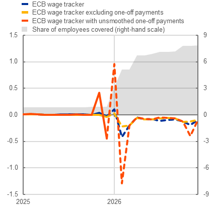 Compared with the February 2026 data release, the ECB wage tracker with smoothed one-off payments has been revised down by 0.1 percentage points for 2026. The ECB wage tracker with unsmoothed one-off payments indicates negotiated wage growth of 3.0% in 2025 and 2.6% in 2026 (down by 0.1 percentage points for 2026). The wage tracker excluding one-off payments indicates an easing of negotiated wage growth from 3.9% in 2025 to 2.6% in 2026 (down by 0.1 percentage points for 2026).