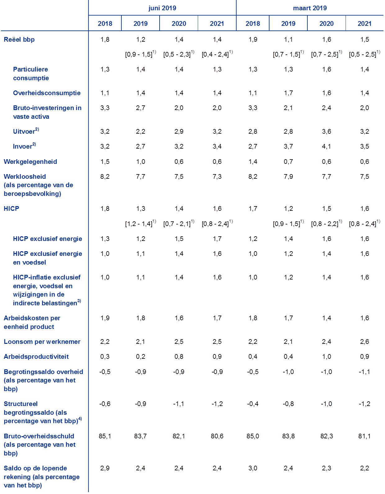 Ten opzichte van de projecties van maart 2019 is de reële bbp-groei naar boven bijgesteld voor 2019 en neerwaarts herzien voor 2020 en 2021. In 2019 doet de positieve verrassing voor de groei in het eerste kwartaal de neerwaartse bijstellingen voor de rest van het jaar meer dan teniet. Deze bijstellingen zijn toe te schrijven aan: (a) het wegebben van de tijdelijke factoren die de groei in het eerste kwartaal hebben gestimuleerd, (b) het verzwakte vertrouwen en neerwaartse bijstellingen van de buitenlandse vraag, grotendeels als gevolg van de langer durende mondiale beleidsonzekerheid (bijv. de brexit en handelsgeschillen), en (c) aanhoudende beleidsonzekerheid in Italië. Deze neerwaartse herzieningen van de kortetermijnvooruitzichten impliceren een zwakkere doorwerking in 2020. De vooruitzichten voor de middellange termijn zijn slechts licht herzien.