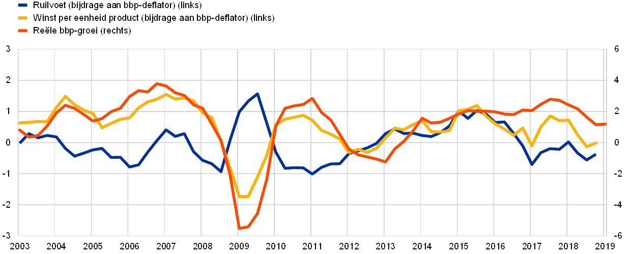 De ontwikkelingen in de winst per eenheid product houden nauw verband met conjuncturele ontwikkelingen in de economische bedrijvigheid en worden soms ook in aanzienlijke mate beïnvloed door de ruilvoet. Tijdens de economische vertraging in 2018 stonden de winsten onder druk, aangezien ze de stijgende arbeidskosten per eenheid product moesten opvangen, deels in verband met de vertraging van de bedrijvigheid en productiviteitsontwikkelingen. Bovendien hebben de stijging van de olieprijzen en de weerslag daarvan op de ruilvoet waarschijnlijk ook enig neerwaarts effect gehad op de winsten in dat jaar, mits ondernemingen de stijging van hun productiekosten niet geheel lieten doorwerken in hun verkoopprijzen (zie Grafiek B). Een tegengesteld, gunstig effect van de ruilvoet werd waargenomen in 2014 en 2015, toen de olieprijzen scherp waren gedaald en deze dalingen slecht ten dele doorwerkten in de prijzen. De vooruitzichten volgens de projecties van juni houden een terugkeer in naar een sterkere groei van zowel het reële bbp als de productiviteit, terwijl de aannames over de olieprijs bijdragen aan het ongedaan maken van de eerdere negatieve groei van de ruilvoet. Samen ondersteunen deze factoren een verhoging van de bijdrage van de winst per eenheid product aan de inflatie zoals gemeten door de bbp-deflator gedurende de projectieperiode. In zo'n situatie zouden bovendien eerdere loon- en arbeidskostenstijgingen zichtbaarder kunnen worden doorberekend in de prijzen.