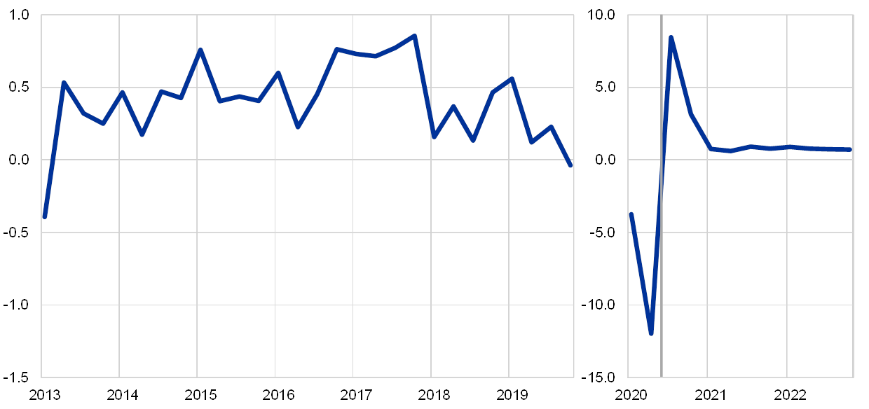 Euro zonas reālā IKP pieaugums 3. ceturksnī saskaņā ar smago scenāriju ir 4.8% un saskaņā ar mēreno scenāriju – 9.4%, bet 4. ceturksnī saskaņā ar abiem scenārijiem izaugsmes kāpums samazinās (sk. A att.). Šie scenāriji liecina par spēcīgu ekonomiskās aktivitātes atjaunošanos 3. ceturksnī, lai arī tiek prognozēts, ka reālā IKP līmenis saskaņā gan ar mēreno, gan smago scenāriju 2020. gada 3. ceturksnī joprojām saglabāsies būtiski zemāks nekā pirms krīzes. Reālā IKP kāpums saskaņā ar mēreno un smago scenāriju 4. ceturksnī saruks attiecīgi līdz 5.0% un 1.3%. Atveseļošanās temps smagajā scenārijā ir lēnāks sakarā ar pieņēmumu par stingrākiem ierobežojošajiem pasākumiem, kas būtu nepieciešami, ņemot vērā, ka vīrusa ierobežošanas sekmes būtu minimālas un sekotu spēcīgs vīrusa atkārtotas izplatības vilnis.