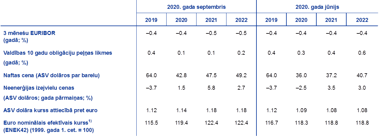 Salīdzinājumā ar Eurosistēmas speciālistu 2020. gada jūnija iespēju aplēsēm pašreizējie tehniskie pieņēmumi ietver daudz augstākas naftas cenas, euro efektīvā kursa kāpumu un zemākas ilgtermiņa procentu likmes. Tehniskie pieņēmumi par procentu likmēm un izejvielu cenām balstīti uz tirgus gaidām atbilstoši stāvoklim 2020. gada 18. augustā. Īstermiņa procentu likmes attiecas uz 3 mēnešu EURIBOR, tirgus gaidas iegūstot, pamatojoties uz biržā tirgoto nākotnes līgumu procentu likmēm. Saskaņā ar attiecīgo metodiku šo īstermiņa procentu likmju vidējais rādītājs 2020. gadā būs –0.4%, bet 2021. un 2022. gadā – –0.5%. Tirgus gaidas attiecībā uz euro zonas valstu valdības 10 gadu obligāciju nominālajām peļņas likmēm rāda, ka 2020. un 2021. gadā vidējais gada līmenis būs 0.1% un 2022. gadā – 0.2%.[2] Salīdzinājumā ar Eurosistēmas speciālistu 2020. gada jūnija iespēju aplēsēm tirgus gaidas attiecībā uz īstermiņa procentu likmēm nedaudz pazeminājušās, savukārt euro zonas valstu valdības 10 gadu obligāciju nominālās peļņas likmes 2021. un 2022. gadam koriģētas un samazinātas aptuveni par 30 bāzes punktiem.