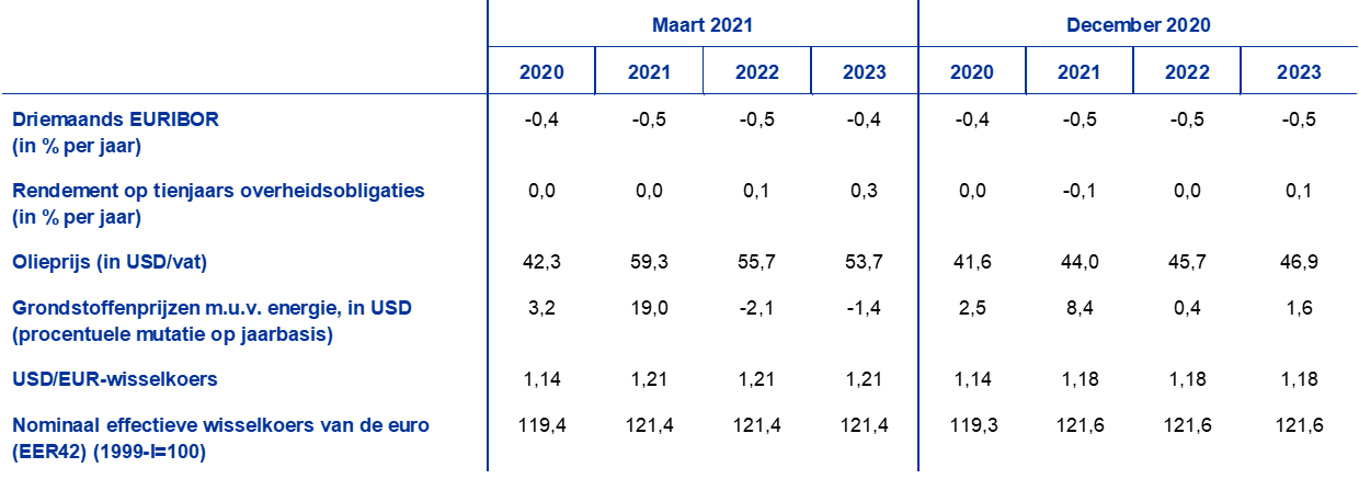 Vergeleken met de projecties van december 2020 wordt bij de huidige technische aannames uitgegaan van een hogere lange rente, aanzienlijk duurdere olie en een lichte daling van de effectieve wisselkoers van de euro. De technische aannames met betrekking tot de rente en de grondstoffenprijzen zijn gebaseerd op de marktverwachtingen, met als afsluitingsdatum 16 februari 2021. Voor de korte rente wordt de driemaands Euribor als referentiepunt gebruikt, waarbij de marktverwachtingen voor de rente worden afgeleid van de rente op futurescontracten. Deze methodologie levert voor de korte rente een gemiddelde stand op van -0,5% voor 2021 en 2022, en -0,4% voor 2023. De marktverwachtingen voor het nominale rendement op tienjaars overheidsobligaties uit het eurogebied duiden op een gemiddeld renteniveau op jaarbasis van 0,0% voor 2021, 0,1% voor 2022 en 0,3% voor 2023.[2] Ten opzichte van de projecties van december 2020 zijn de marktverwachtingen voor de korte rente zeer licht gestegen voor 2023. Voor tienjaars overheidsobligaties uit het eurogebied gingen diezelfde verwachtingen met 10-20 basispunten omhoog voor de periode 2021-2023.