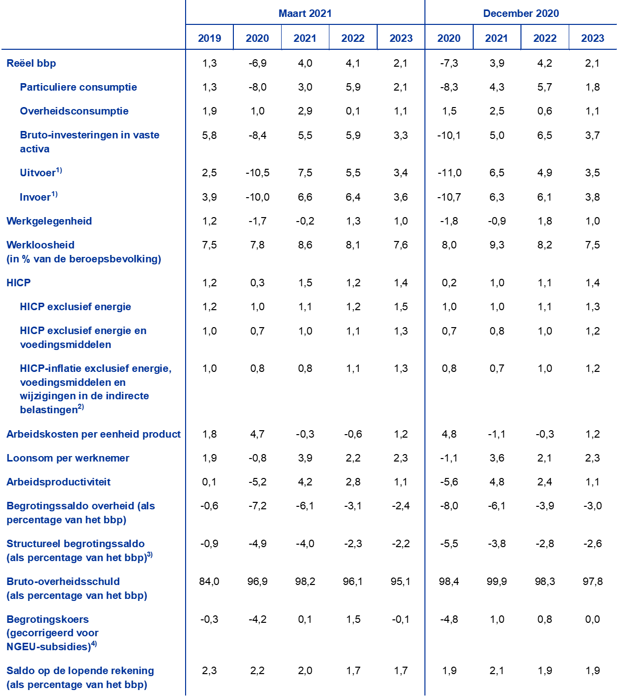 Toelichting: Het reële bbp en de componenten daarvan, de arbeidskosten per eenheid product, de loonsom per werknemer en de arbeidsproductiviteit zijn gecorrigeerd voor seizoensinvloeden en het aantal werkdagen. De cijfers kunnen afwijken van die in de meest recente Eurostat-publicaties wanneer er na de afsluitingsdatum van de projecties nog gegevens gepubliceerd zijn. In deze tabel is geen band rond de projecties opgenomen. De reden daarvoor is dat de standaardberekening van de bandbreedte (gebaseerd op historische projectiefouten) in de huidige omstandigheden geen betrouwbare indicatie zou geven van de ongekende onzekerheid rond de huidige projecties. Om de huidige onzekerheid beter weer te geven zijn daarom in Paragraaf 5 alternatieve scenario’s opgenomen op basis van verschillende aannames met betrekking tot de toekomstige ontwikkeling van de coronapandemie en de daarmee samenhangende beheersingsmaatregelen.