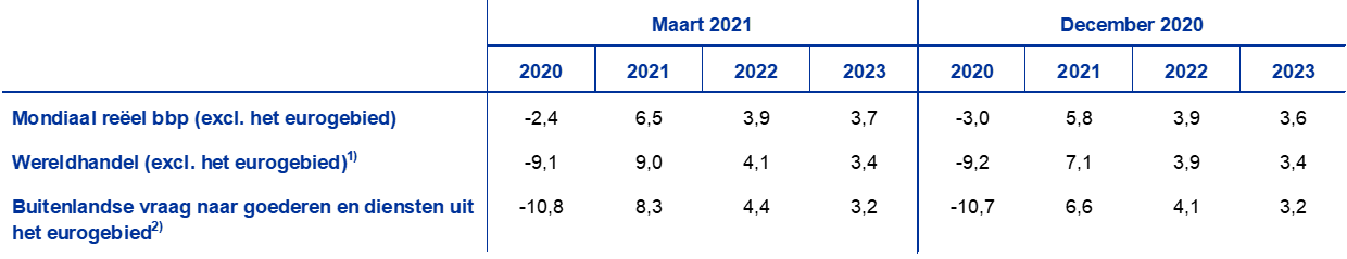Al met al zal het mondiale reële bbp (exclusief het eurogebied) in 2021 met 6,5% stijgen. Daarna vertraagt de groei naar 3,9% en 3,7% in respectievelijk 2022 en 2023. Dit volgt op de geraamde krimp van het reële mondiale bbp met 2,4% in 2020. De groei voor 2021 is met 0,7 procentpunt naar boven bijgesteld, omdat de positieve doorwerking van de meevallers van eind vorig jaar en meer steun vanuit het economisch beleid slechts deels worden tenietgedaan door de negatieve gevolgen van strengere beheersingsmaatregelen op korte termijn.