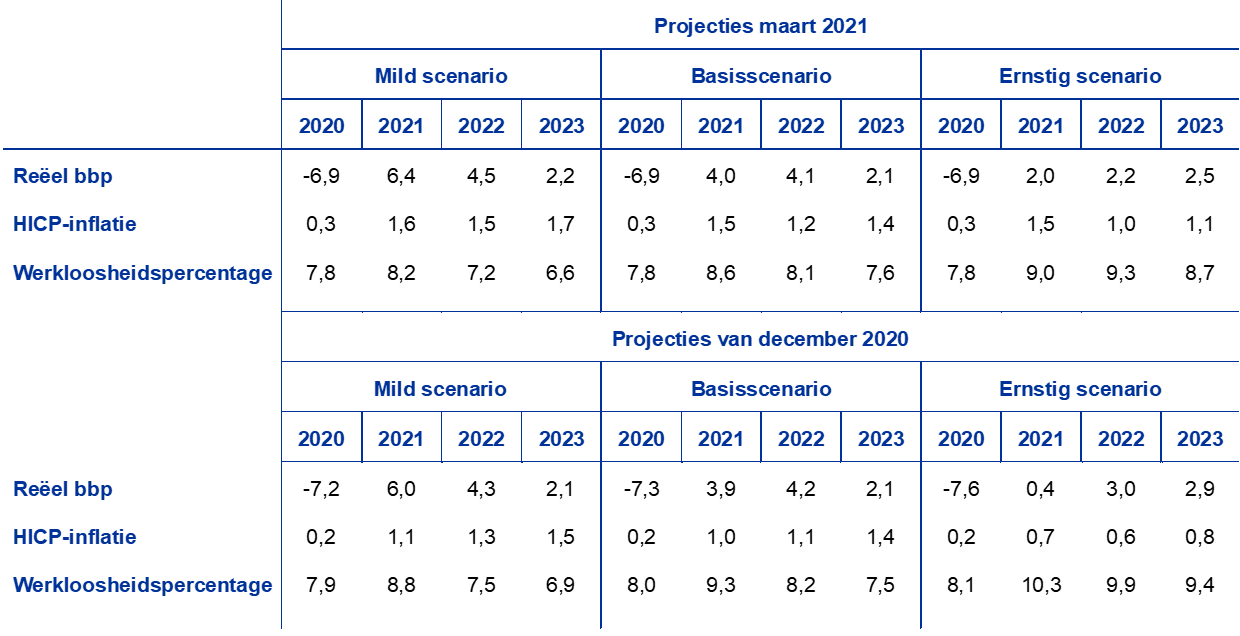 Dat de coronapandemie (COVID-19) recent is verergerd, verzwakt de vooruitzichten voor het eurogebied op korte termijn. Het herstel is daarmee echter nog niet ontspoord. Ondanks de verlengde en strengere beheersingsmaatregelen is de bedrijvigheid in het vierde kwartaal van 2020 duidelijk minder sterk teruggelopen dan was verwacht in de projecties van medewerkers van het Eurosysteem in december 2020. Leereffecten, een sterke groei van de industriële productie en een herstel van de buitenlandse vraag lagen hieraan ten grondslag. Hoewel de nieuwe lockdowns gepaard gingen met extra budgettaire steunmaatregelen wordt er voor het eerste kwartaal van 2021 een verdere daling van de bedrijvigheid verwacht. De vooruitzichten voor de bedrijvigheid op korte termijn hangen af van de ontwikkeling van de pandemie en vooral ook van de snelheid en de mate waarin het vaccinatietempo een afbouw van de beheersingsmaatregelen mogelijk maakt. Vergeleken met de projecties van december 2020 wordt in de aannames nu rekening gehouden met strengere beheersingsmaatregelen in de eerste helft van 2021, totdat de gecoördineerde inspanningen om de productie en distributie van de vaccins te verhogen het mogelijk maken om de teugels meer te vieren en de crisis begin 2022 uiteindelijk wordt bedwongen, in overeenstemming met eerdere projecties. In combinatie met de aanzienlijke steun van monetaire en budgettaire beleidsmaatregelen (deels vanuit het Next Generation EU-herstelfonds) en een verder herstel van de buitenlandse vraag kan dit vanaf de tweede helft van 2021 de bedrijvigheid krachtig doen opveren. Het reële bbp zal naar verwachting vanaf het tweede kwartaal van 2022 het niveau van vóór de crisis overtreffen. Dat is een kwartaal eerder dan in eerdere projecties werd voorzien. Het komt er dus op neer dat de vooruitzichten voor het reële bbp op middellange termijn grotendeels hetzelfde blijven als verwacht in de projecties van december 2020. Aangenomen wordt dat het dankzij de beleidsmaatregelen mogelijk zal zijn om grote financiële versterkingseffecten af te wenden en langdurige economische schade van de crisis te beperken. Verwacht wordt dan ook dat het reële bbp eind 2023 3,3% boven het precrisisniveau van 2019 zal liggen.[1]