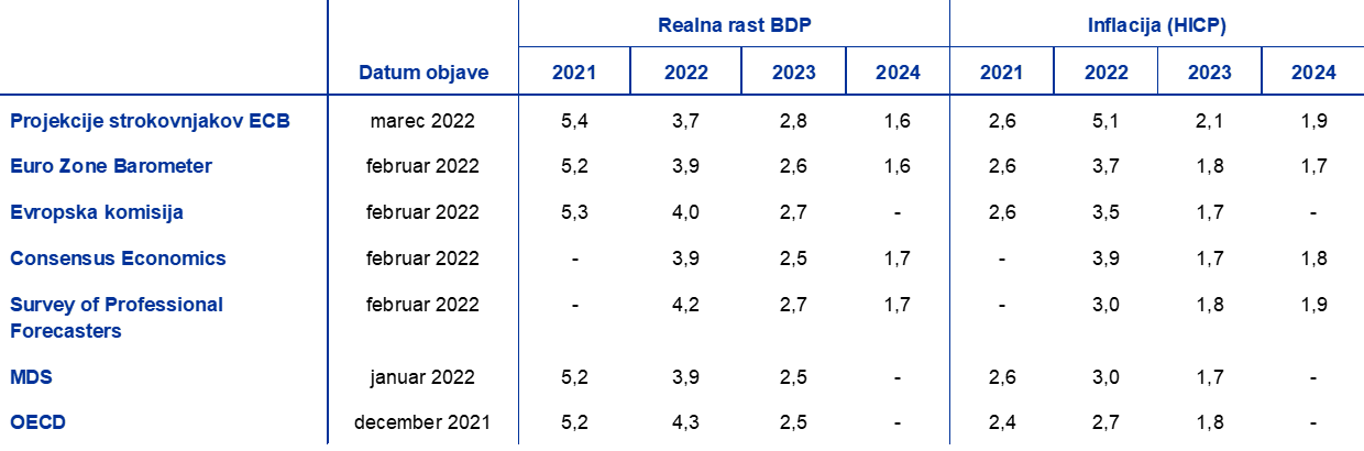 Viri: MJEconomics za Euro Zone Barometer, 24. februar 2022, podatki za leto 2024 so vzeti iz letošnje januarske ankete; zimska gospodarska napoved Evropske komisije (vmesna), 10. februar 2022; napovedi Consensus Economics, 10. februar 2022, podatki za leto 2024 so vzeti iz letošnje januarske ankete; anketa ECB o napovedih drugih strokovnjakov (Survey of Professional Forecasters), prvo četrtletje 2022, izvedena med 7. in 13. januarjem; World Economic Outlook Update, MDS, 25. januar 2022; OECD Economic Outlook 110, december 2021.