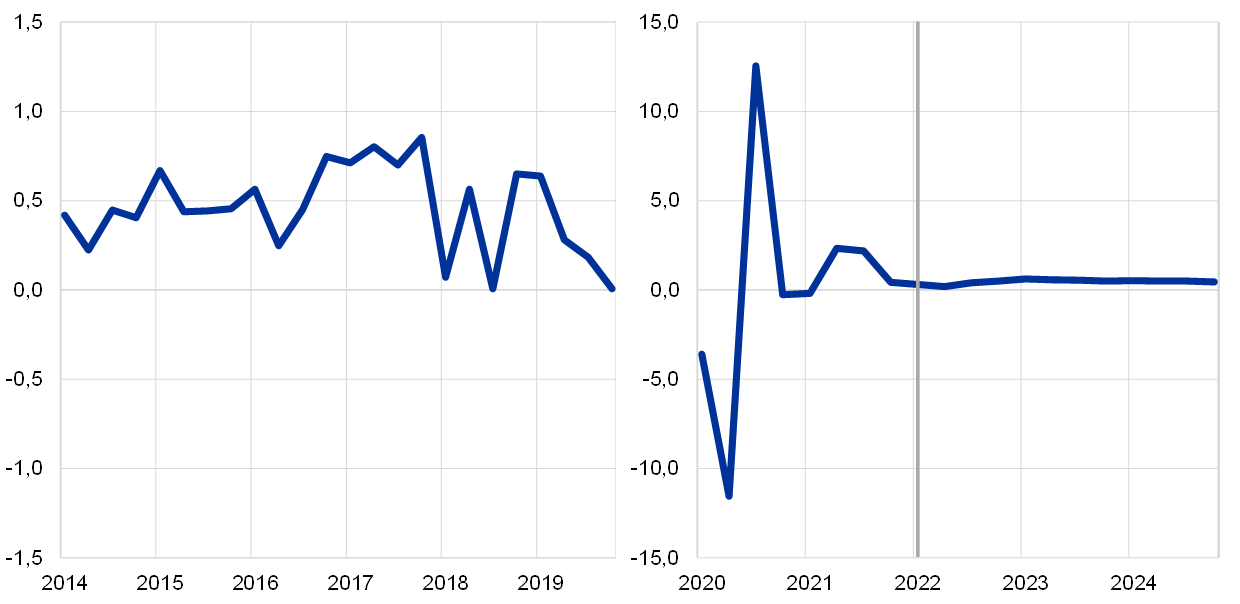 Notas: Os dados são corrigidos de sazonalidade e de dias úteis. Os dados históricos podem divergir das publicações mais recentes do Eurostat, devido à divulgação de dados após a data de fecho da informação para as projeções. A linha vertical indica o início do atual horizonte de projeção.