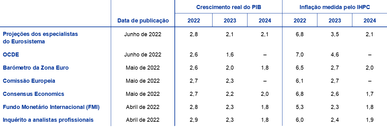Fontes: Economic Outlook 111, da OCDE, de 8 de junho de 2022; Barómetro da Zona Euro da MJEconomics, de 26 de maio de 2022 (os dados para 2024 são retirados do inquérito de abril de 2022); previsões económicas da primavera de 2022 da Comissão Europeia, de 16 de maio de 2022; previsões da Consensus Economics, de 12 de maio de 2022 (os dados para 2024 são retirados do inquérito de abril de 2022); World Economic Outlook do FMI, de 19 de abril de 2022; e inquérito do BCE a analistas profissionais para o segundo trimestre de 2022, de 15 de abril de 2022.