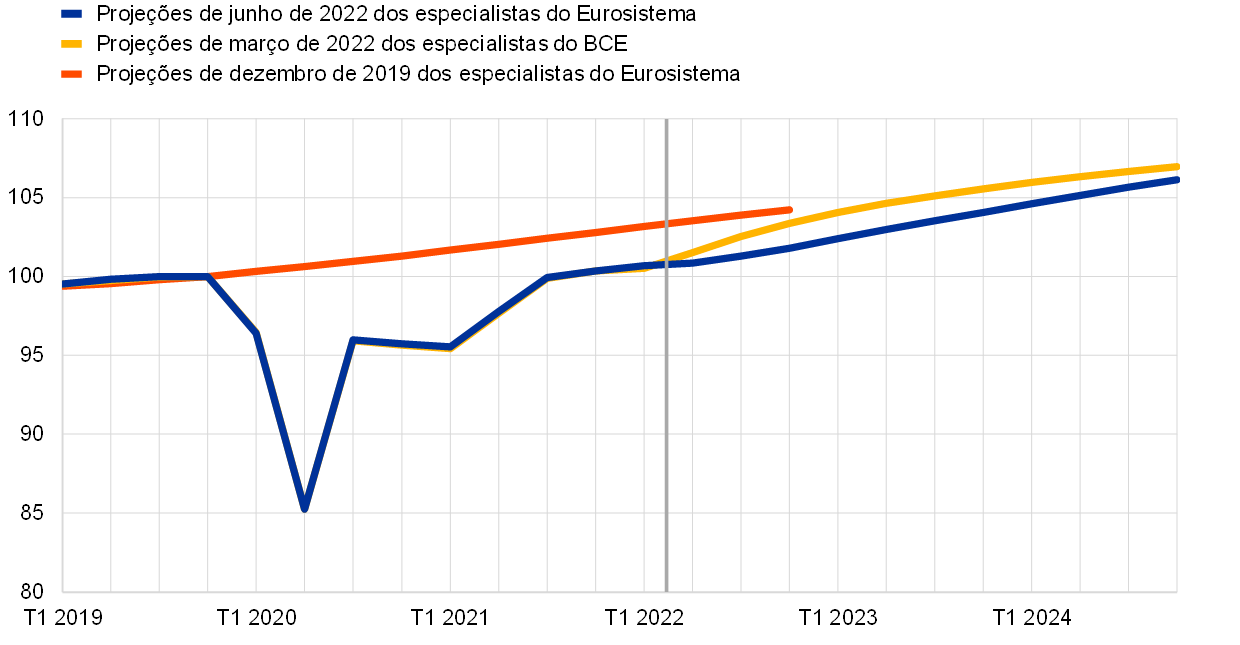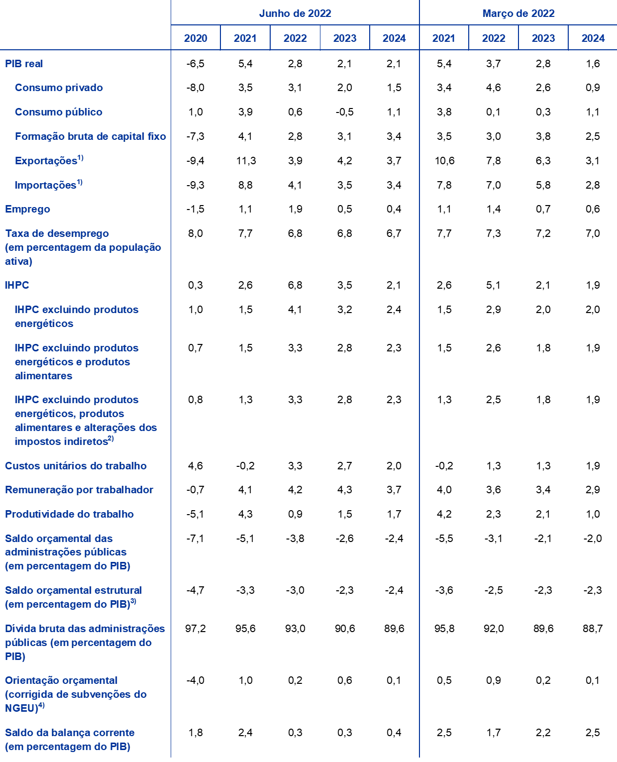 Em comparação com as projeções de março de 2022, o crescimento real do PIB foi objeto de uma revisão em baixa de 0,9 pontos percentuais para 2022 e de 0,7 pontos percentuais para 2023, tendo sido revisto 0,5 pontos percentuais em alta para 2024. A deterioração das perspetivas para 2022 reflete sobretudo o impacto negativo da guerra na Ucrânia nos preços dos produtos energéticos e dos produtos alimentares, na confiança e no comércio. A revisão em baixa do crescimento do PIB em 2023 decorre de repercussões negativas de 2022, ao passo que a revisão em alta do valor para 2024 espelha uma retoma da atividade com o desvanecimento dos fatores adversos.