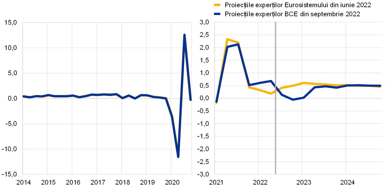 Notă: Date ajustate sezonier și cu numărul zilelor lucrătoare. Datele istorice pot fi diferite de cele mai recente date publicate de Eurostat, având în vedere publicarea acestora după data-limită pentru proiecții. Linia verticală indică începutul orizontului actual de proiecție.