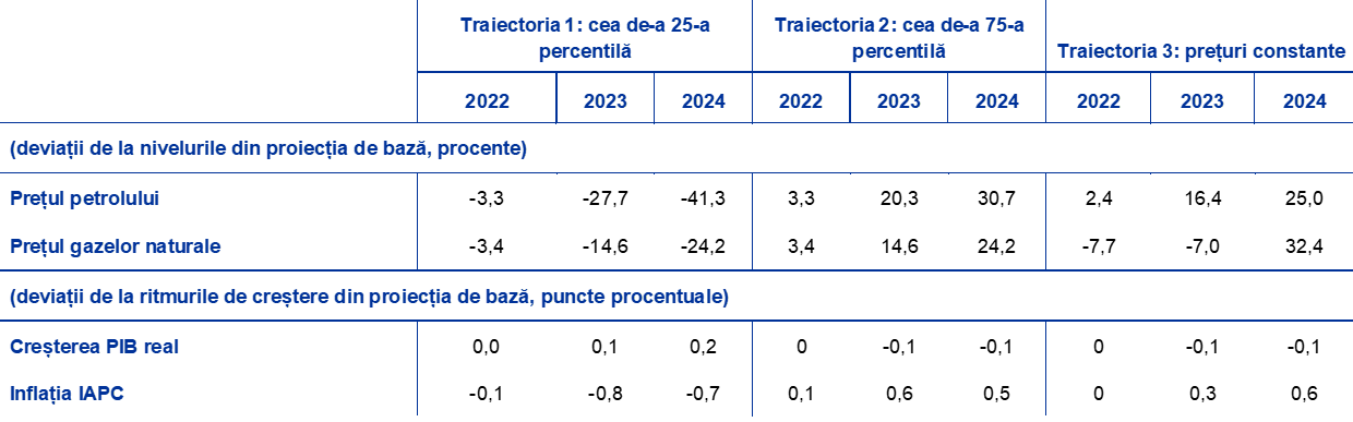 Pentru întregul orizont de proiecție, traiectorii alternative ale prețurilor produselor energetice sunt derivate din prețurile petrolului calculate folosind opțiuni și dintr-o traiectorie constantă a prețurilor. În cadrul acestei analize a senzitivității se utilizează un indice sintetic al prețurilor produselor energetice, care combină cotațiile futures ale petrolului și ale gazelor naturale. Traiectoria alternativă în sensul scăderii și cea în sensul creșterii se bazează pe cea de-a 25-a percentilă și pe cea de-a 75-a percentilă, care se referă la densitățile neutre implicite calculate folosind opțiuni pentru prețul petrolului la data de 22 august 2022 (data-limită pentru includerea ipotezelor tehnice). În absența unor distribuții similare pentru prețurile gazelor naturale, acestea sunt calculate pornind de la cea de-a 25-a percentilă și cea de-a 75-a percentilă a unei distribuții bazate pe erorile recente de prognoză aferente cotațiilor futures ale gazelor naturale. În plus, se ia în considerare o ipoteză privind prețuri constante atât pentru petrol, cât și pentru gazele naturale.
